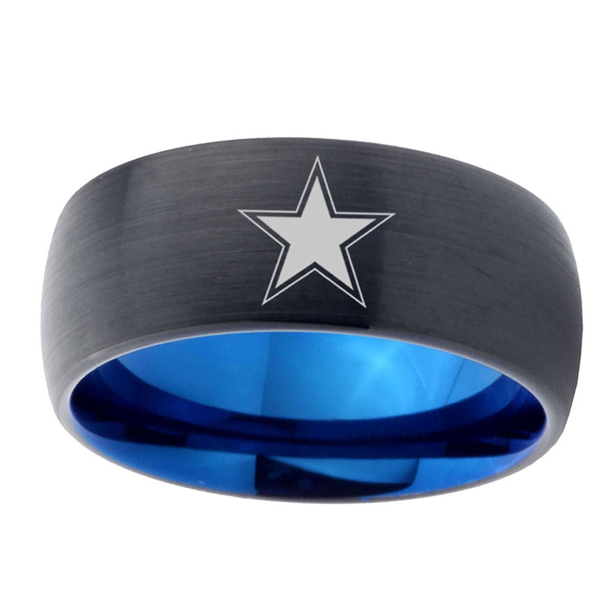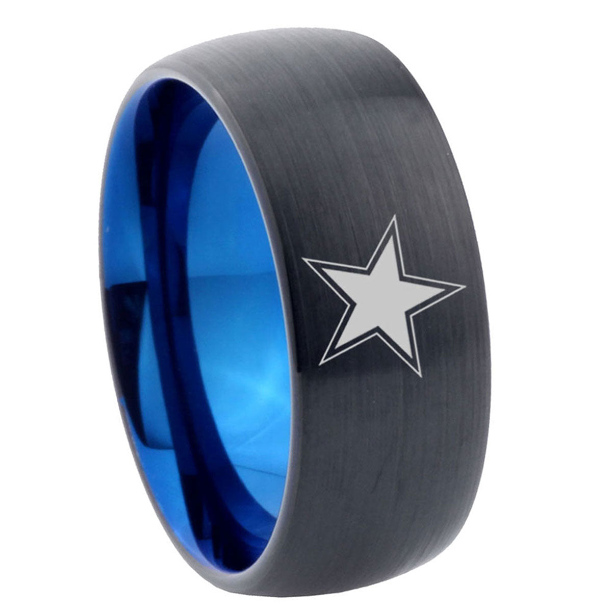 Propose with the 10mm Cowboys Star Dome Tungsten Carbide Blue Engagement Ring. This blue tungsten dome ring with Cowboys Star design is ideal for engagements.