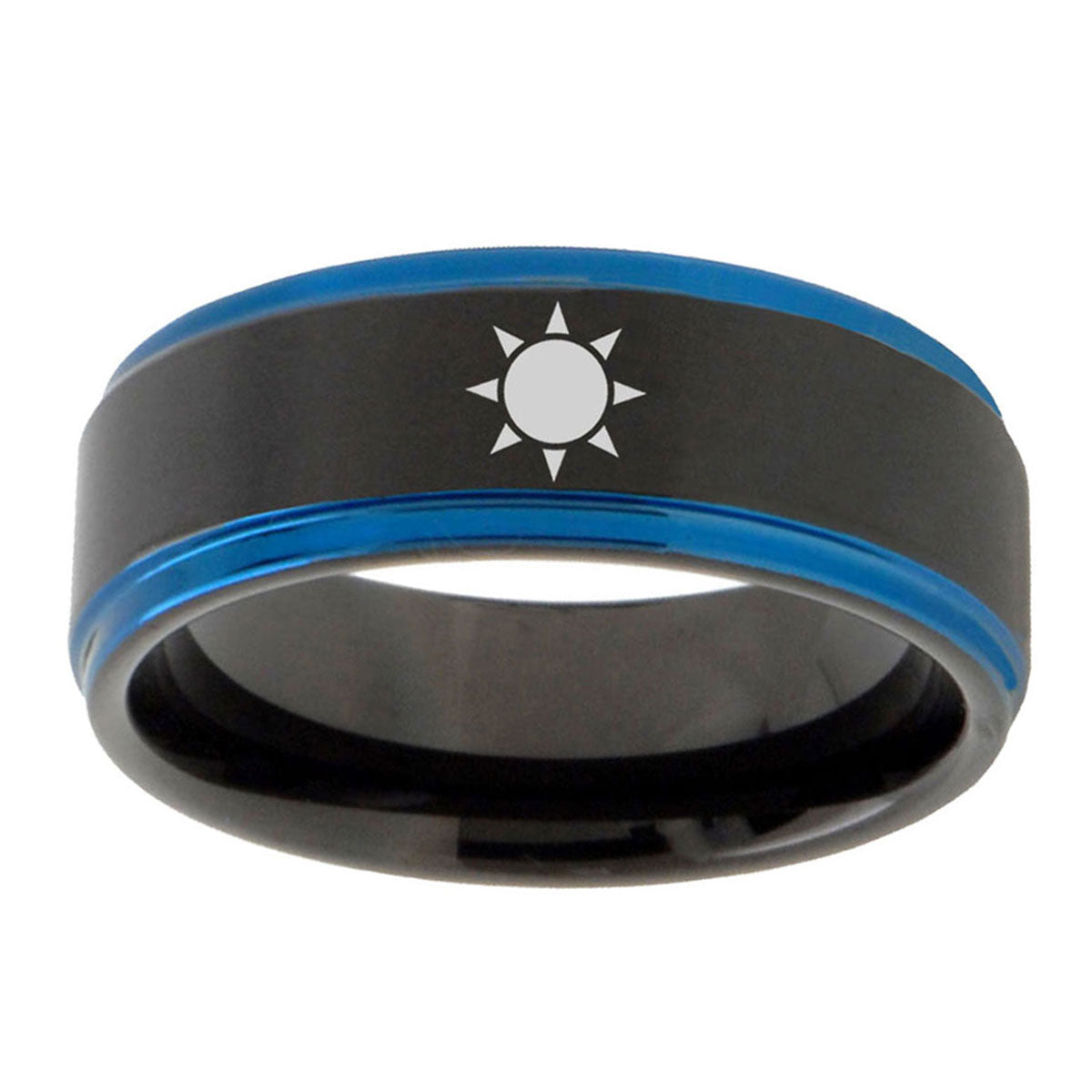 Introuding 5, 8mm Sun Design Blue Step Edges Tungsten Carbide Mens Wedding Ring . Offer in both 5mm and 8mm band width black and blue plated finished from size 4 to 14