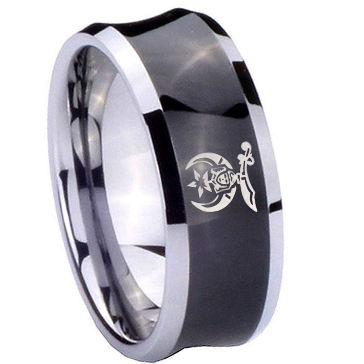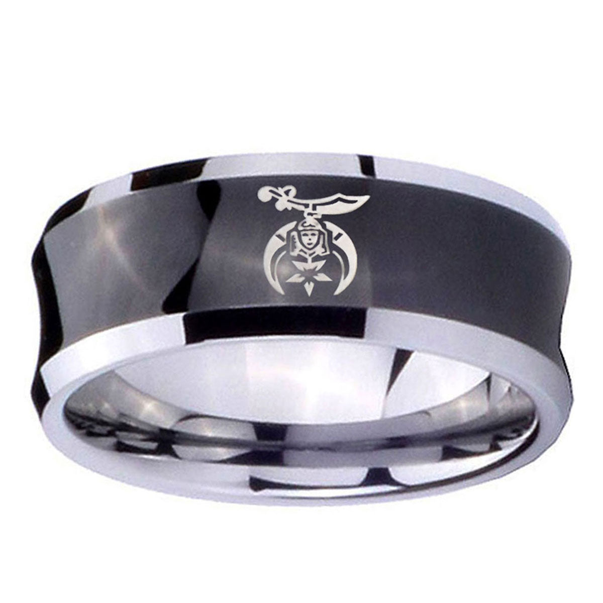 Celebrate with the 10mm Masonic Shriners Concave Black Tungsten Carbide Men's Wedding Band. This concave black tungsten ring with Masonic Shriners design is perfect for weddings.