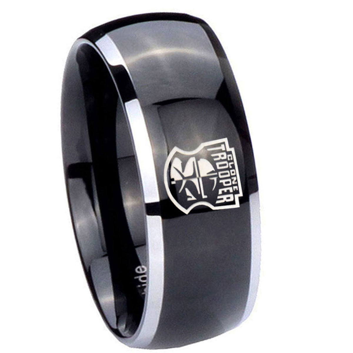 Celebrate with the 10mm Clone Trooper Dome Glossy Black 2 Tone Tungsten Men's Band Ring. This glossy black and 2-tone dome ring with Clone Trooper design is ideal for weddings.
