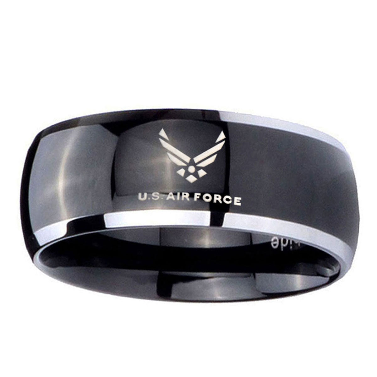 Honor service with the 10mm Dome Glossy Black Middle US Air Force Two Tone Tungsten Men's Ring. This glossy black and 2-tone tungsten dome ring with US Air Force design is perfect for veterans.