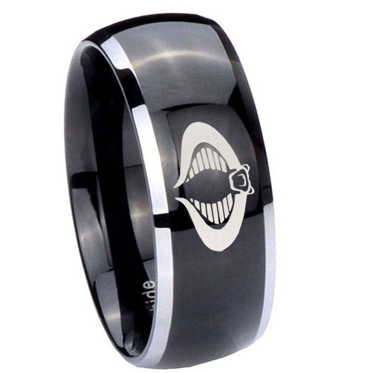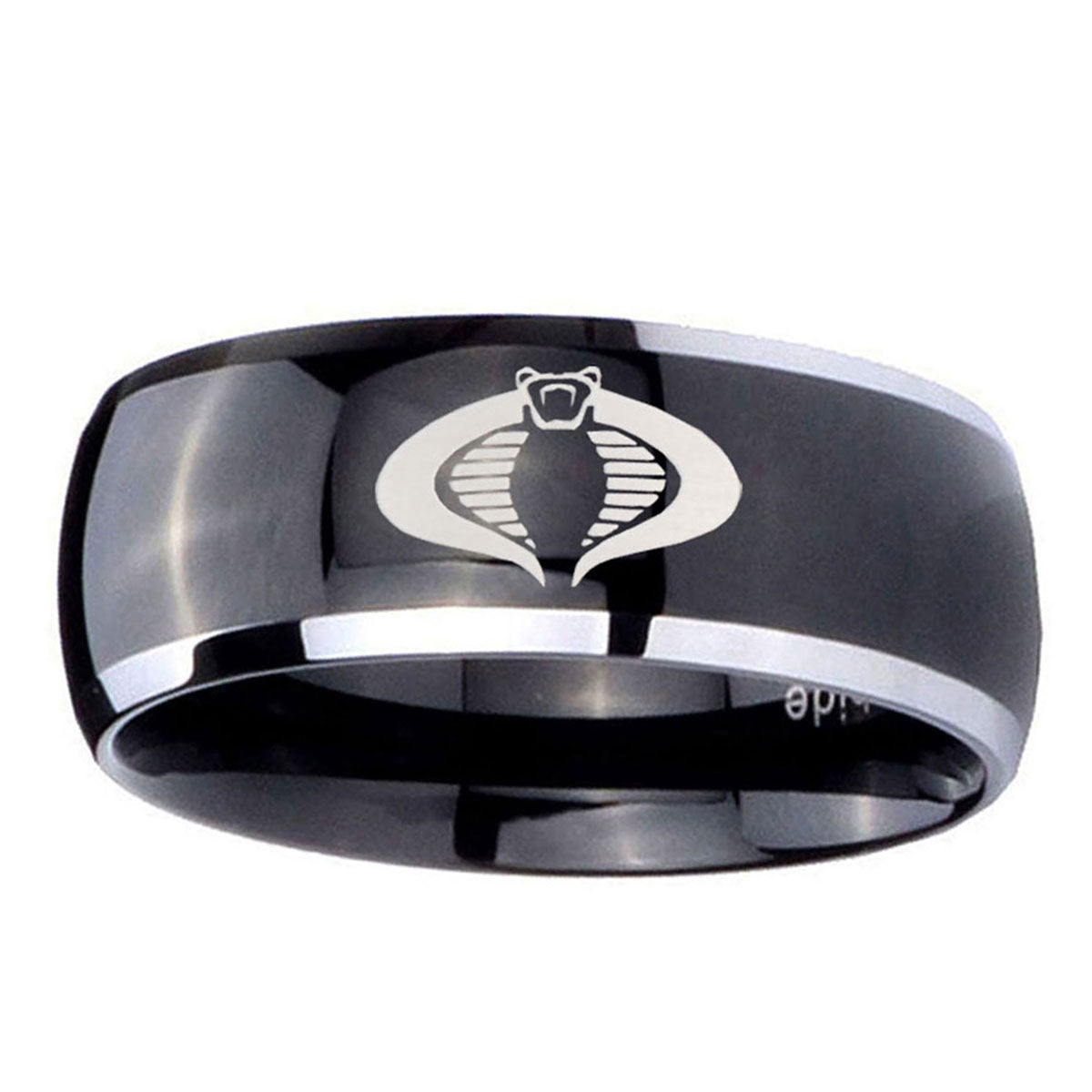 Style the 10mm Cobra Dome Glossy Black 2 Tone Tungsten Carbide Mens Ring. This glossy black and 2-tone dome ring with Cobra design is perfect for men.