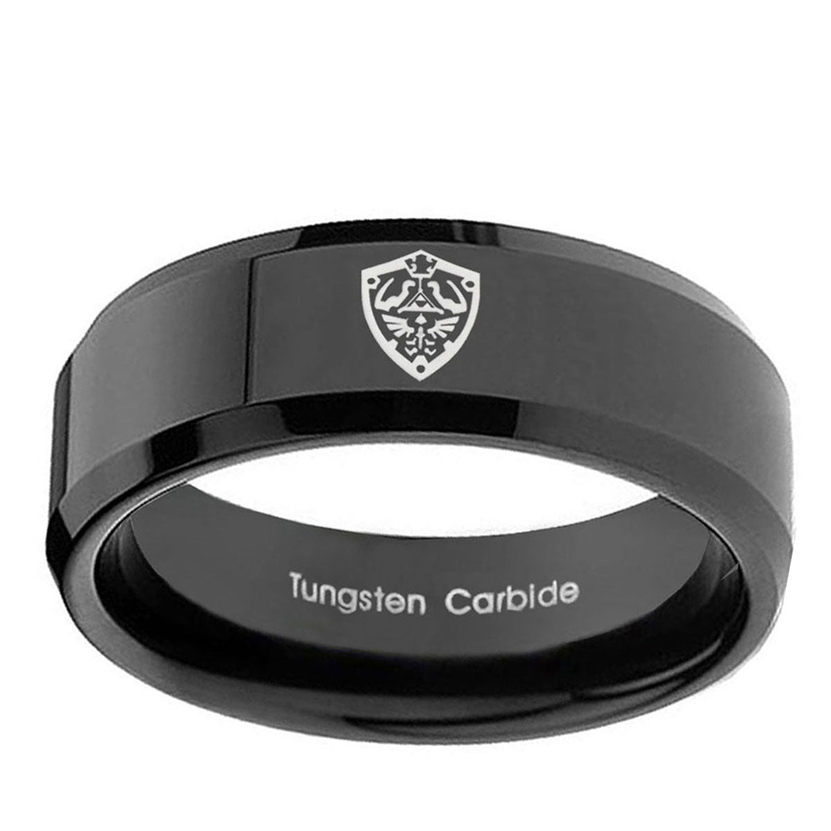 Style the 10mm Zelda Hylian Shield Beveled Edges Black Tungsten Carbide Bands Ring. This black tungsten ring with Zelda Hylian Shield design is perfect for men.
