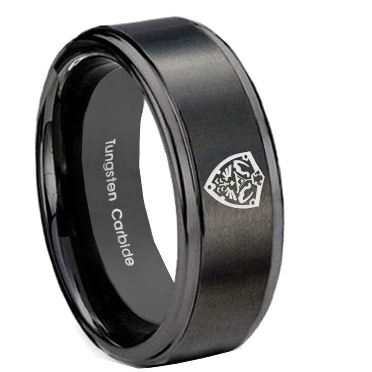 Celebrate with the 10mm Zelda Hylian Shield Step Edges Brush Black Tungsten Wedding Bands Ring. This brushed black ring with step edges and Zelda Hylian Shield design is perfect for weddings.