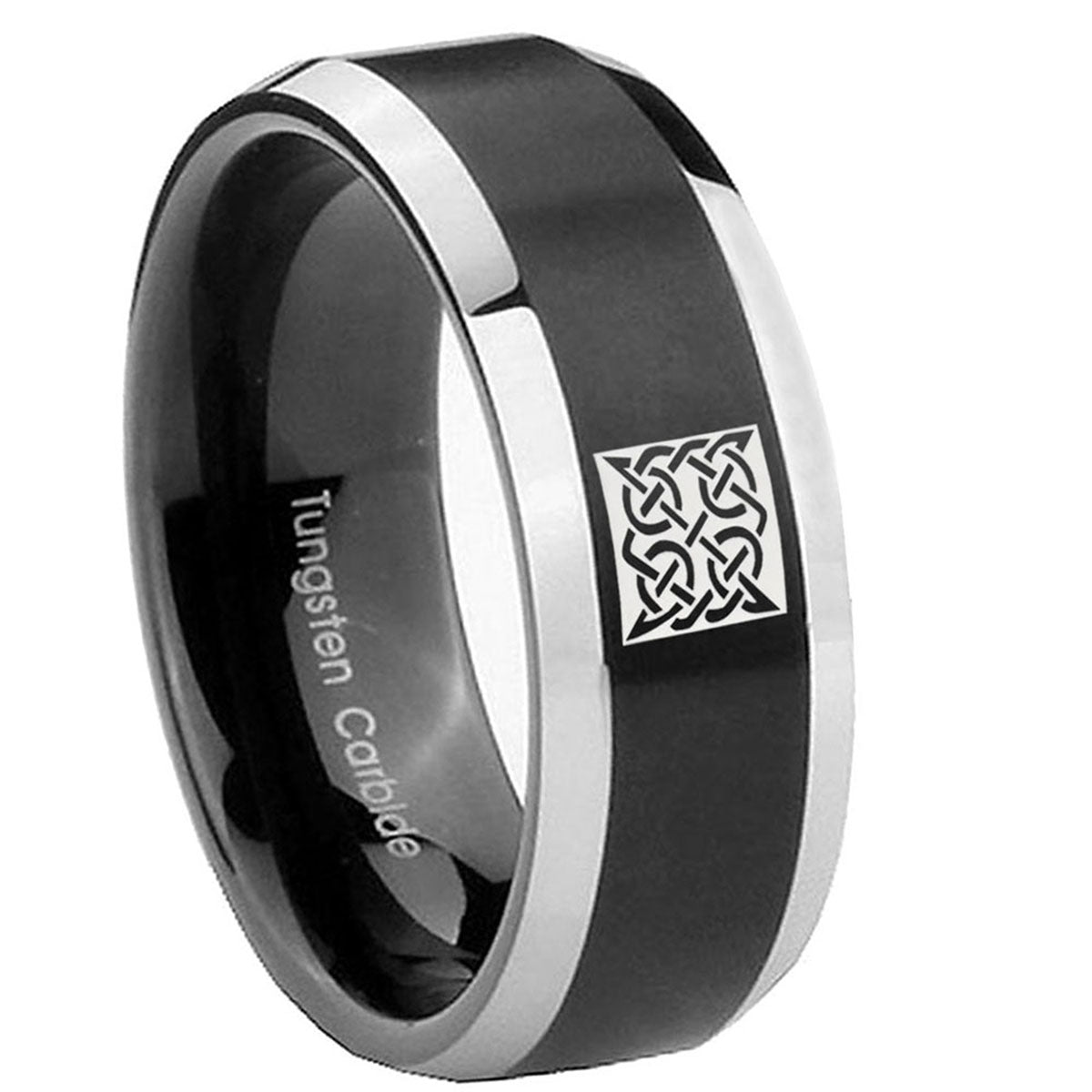 Celebrate with the 10mm Celtic Design Beveled Edges Brush Black 2 Tone Tungsten Wedding Bands Ring. This brushed black and 2-tone tungsten ring with Celtic design is perfect for weddings.