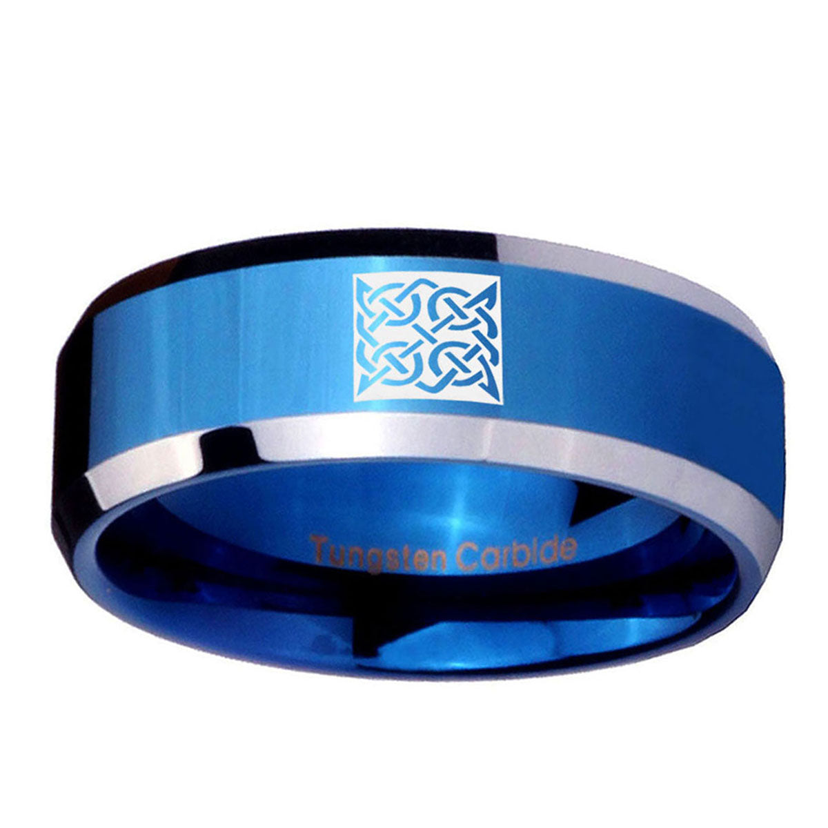 Celebrate with the 10mm Celtic Design Beveled Edges Blue 2 Tone Tungsten Carbide Men's Band Ring. This blue and black 2-tone tungsten ring with Celtic design is perfect for men.