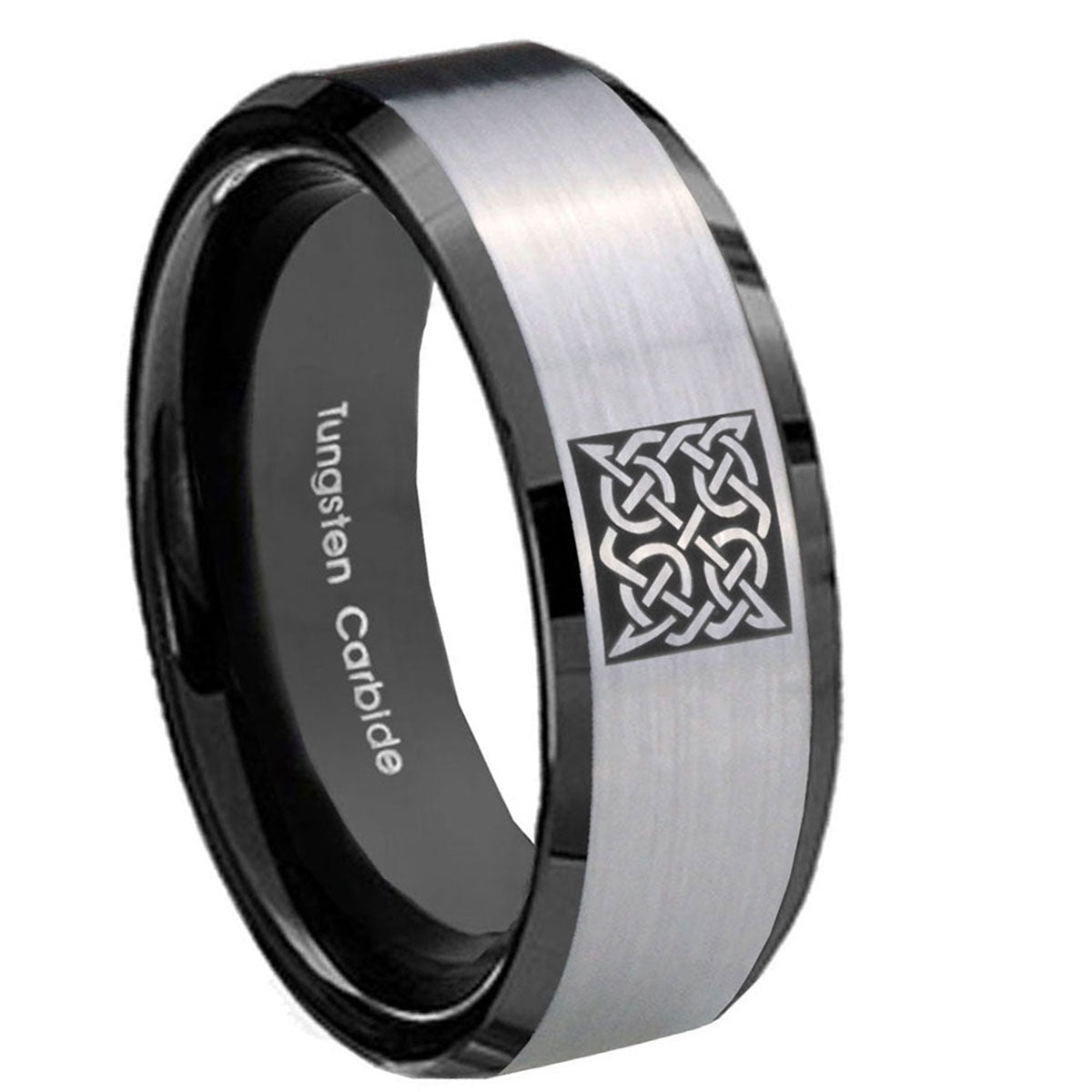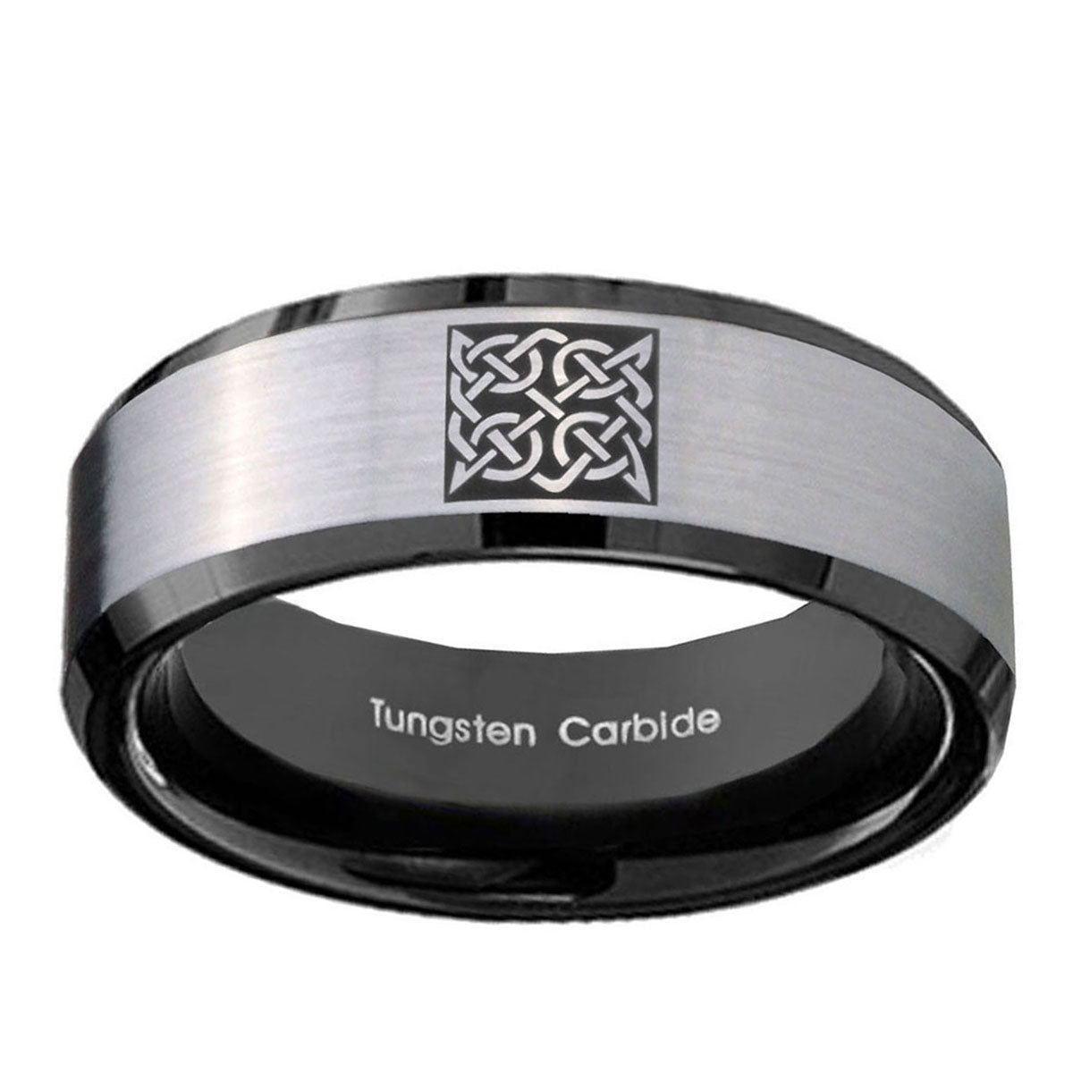 Style the 10mm Celtic Design Beveled Edges Brushed Silver Black Tungsten Men's Bands Ring. This silver and black tungsten ring with Celtic design is perfect for men.