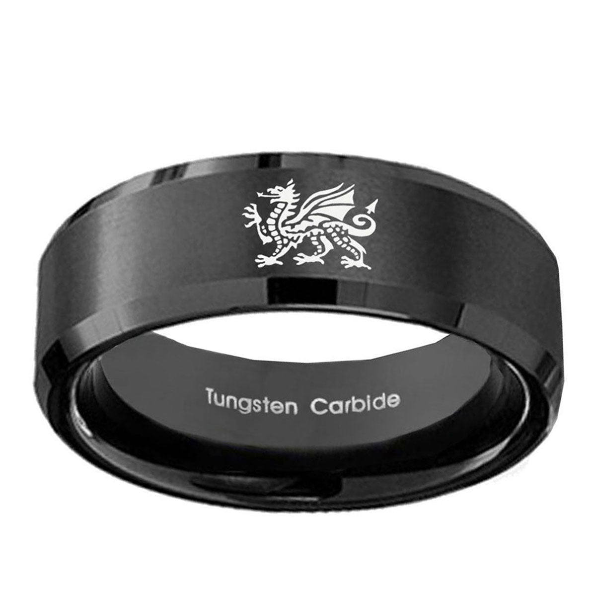 Introuding 5, 8mm Dragon Beveled Edges Brush Black Tungsten Carbide Wedding Engraving Ring . Offer in both 5mm and 8mm band width brushed black plated fnished from size 4 to 14