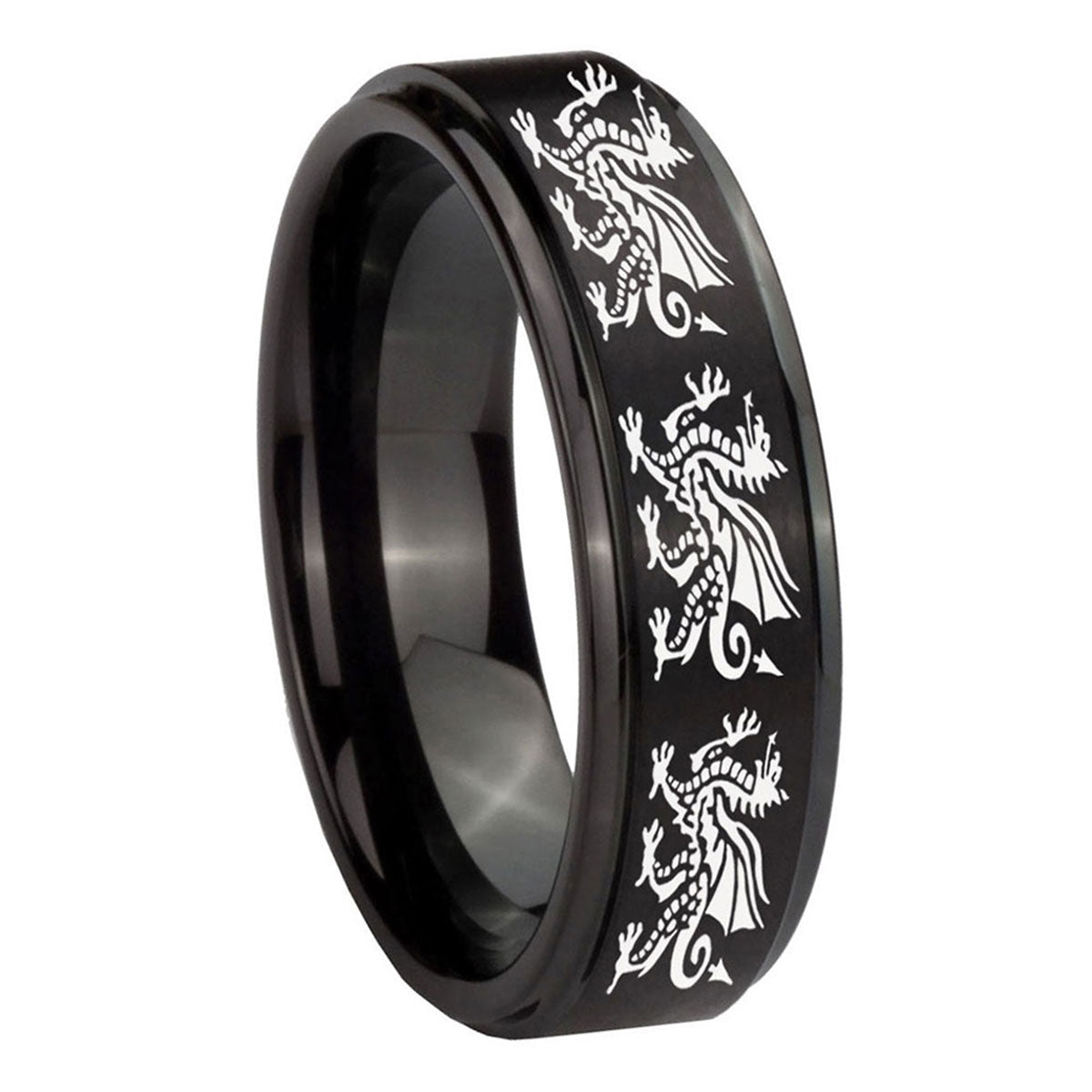 Personalize the 10mm Multiple Dragon Step Edges Brush Black Tungsten Wedding Engraving Ring. This brushed black ring with step edges and Multiple Dragon design is perfect for custom engravings.