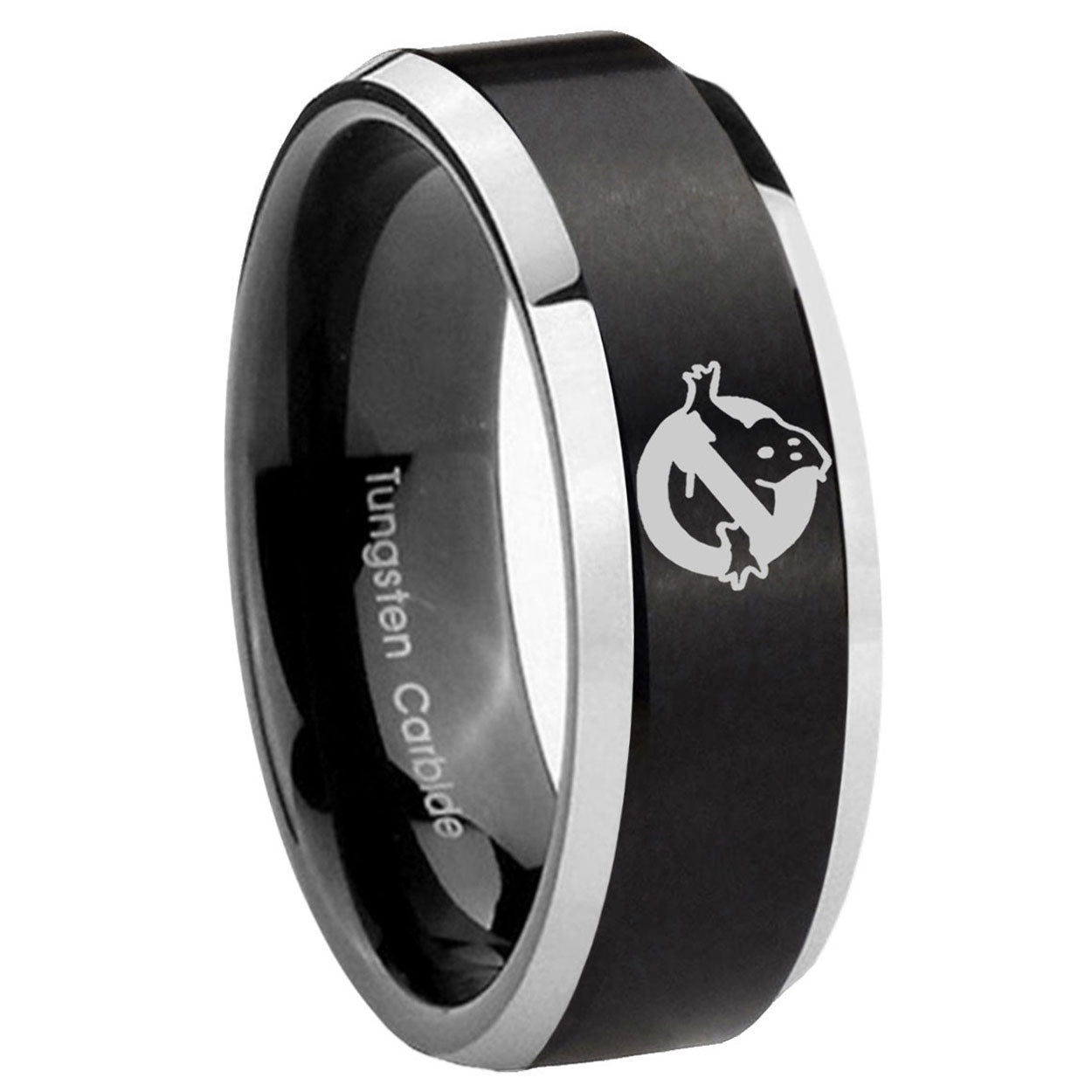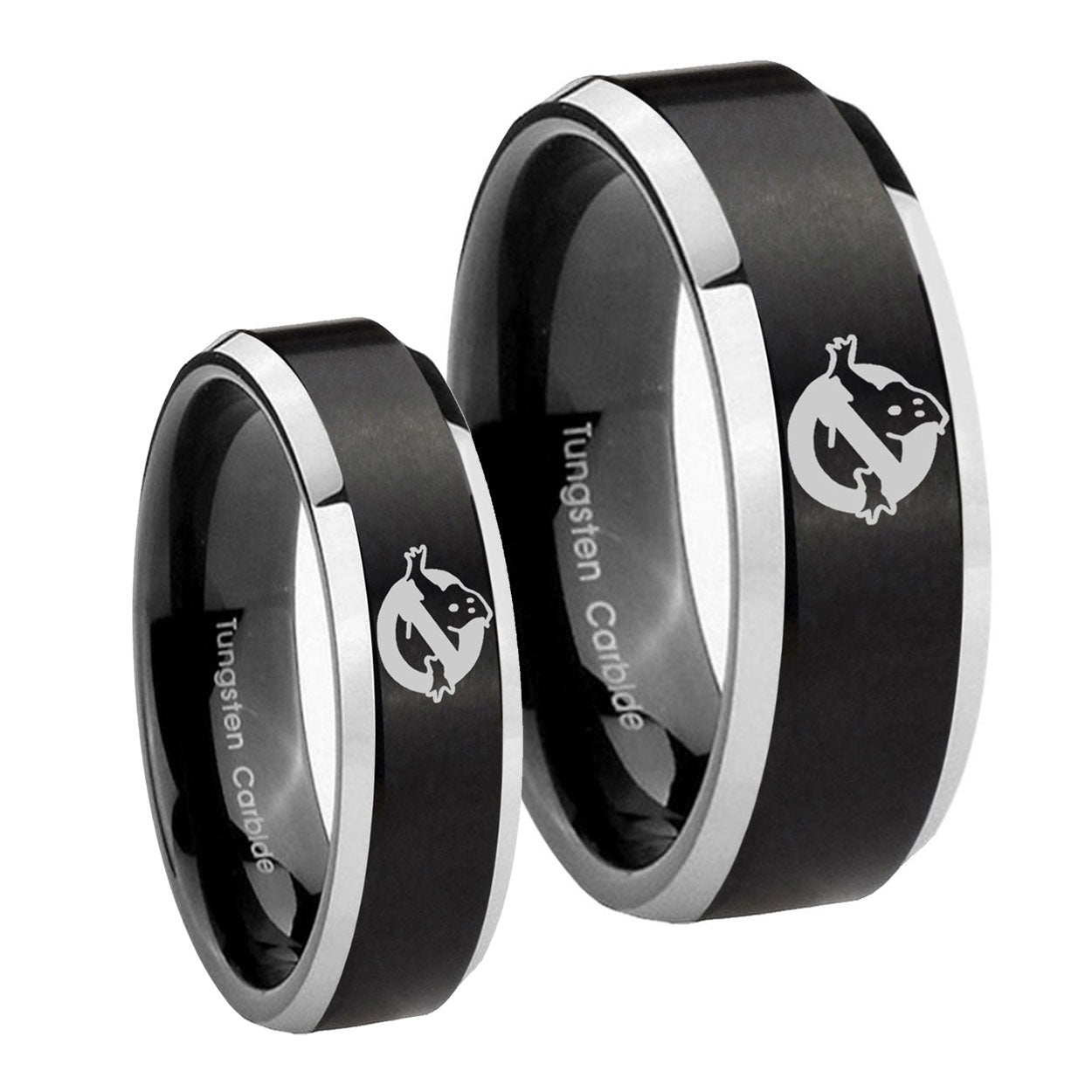 His Hers Ghostbusters Beveled Brush Black 2 Tone Tungsten Wedding Bands Ring Set