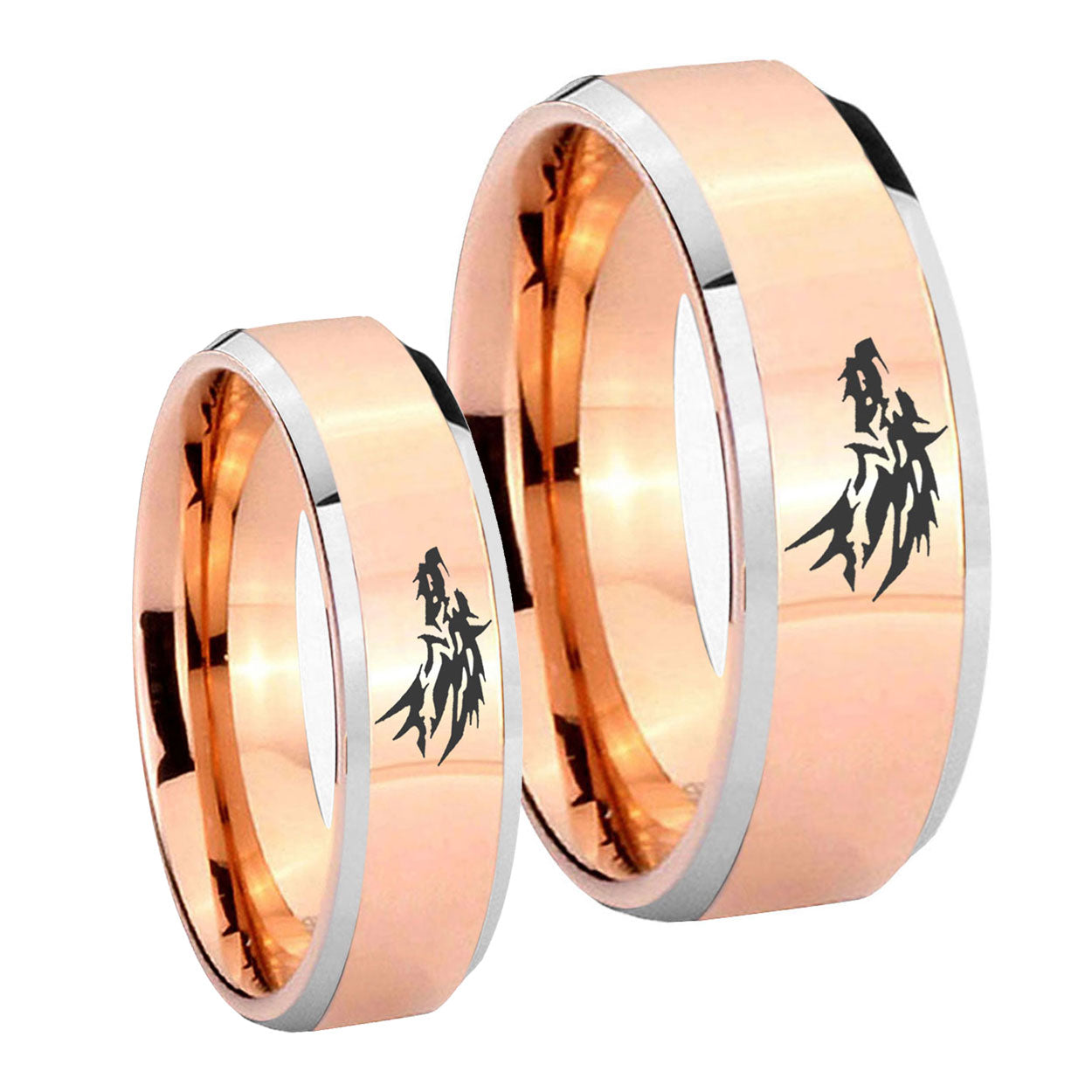 His and Hers Wolf Beveled Edges Rose Gold Tungsten Men's Promise Rings Set