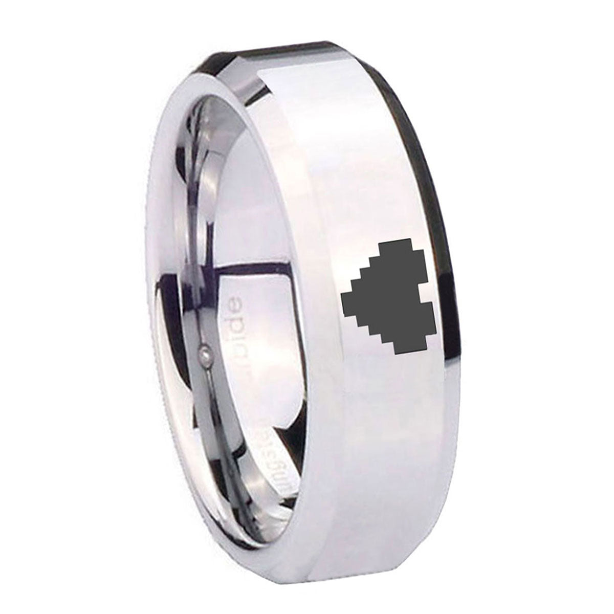 Celebrate gaming with the 10mm Beveled Zelda Heart Mirror Beveled Edges Silver Tungsten Carbide Ring. This silver tungsten ring with Zelda Heart design is perfect for fans.