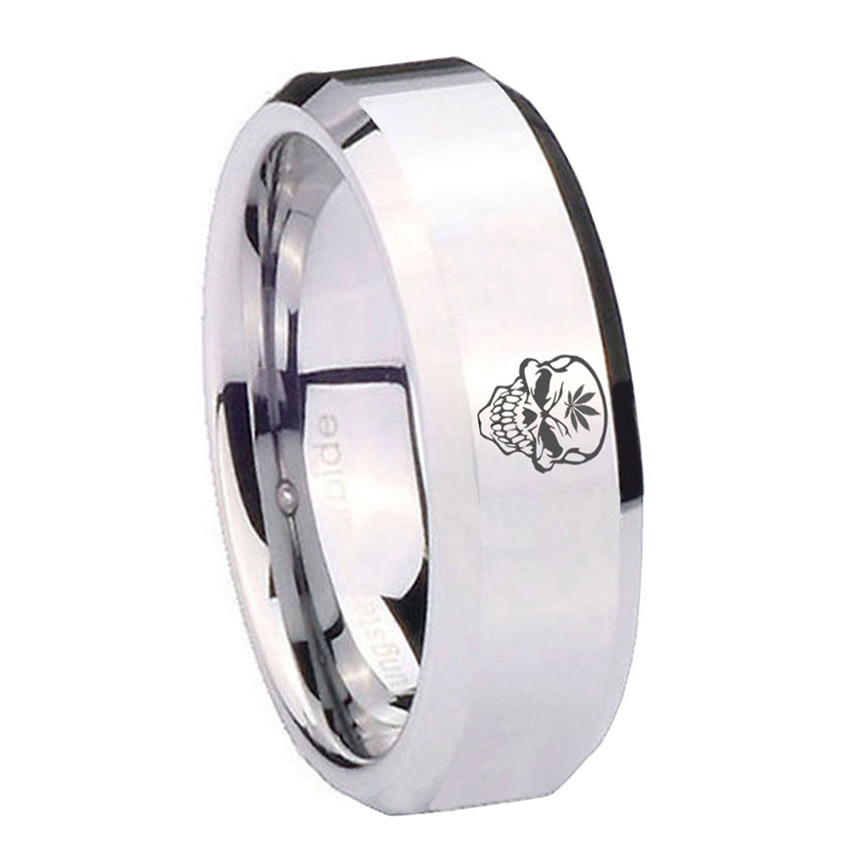 10mm Skull Marijuana Leaf Beveled Edges Silver Tungsten Carbide Promise Ring
