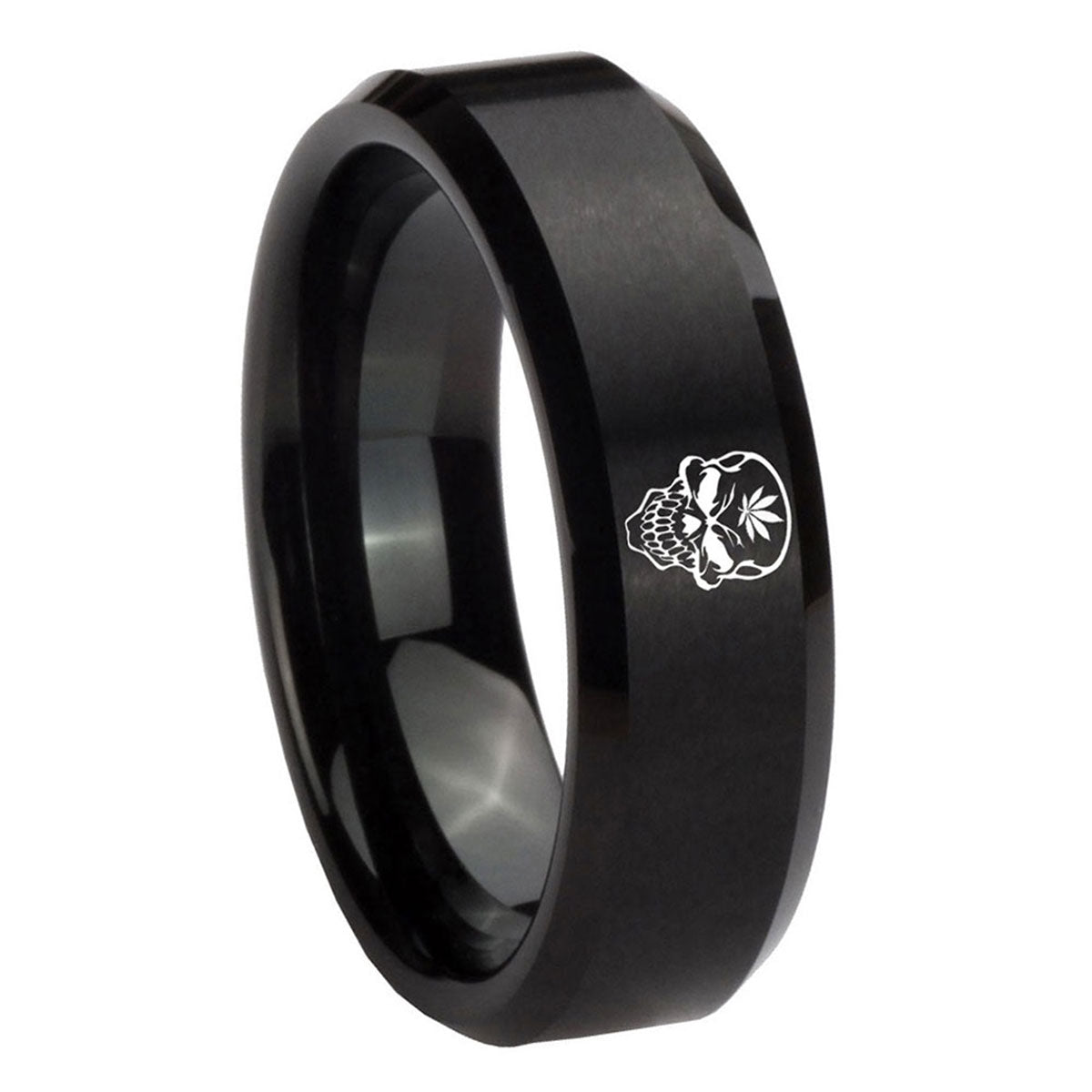 Propose with the 10mm Skull Marijuana Leaf Beveled Edges Brush Black Tungsten Engagement Ring. This brushed black tungsten ring with Skull Marijuana Leaf design is ideal for engagements.