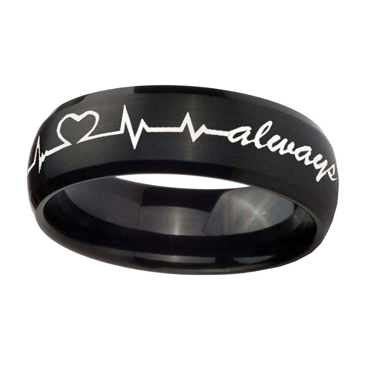 Celebrate with the 10mm Heart Beat forever Heart always Dome Brush Black Tungsten Wedding Band Ring. This brushed black dome ring with Heart Beat design is perfect for weddings.