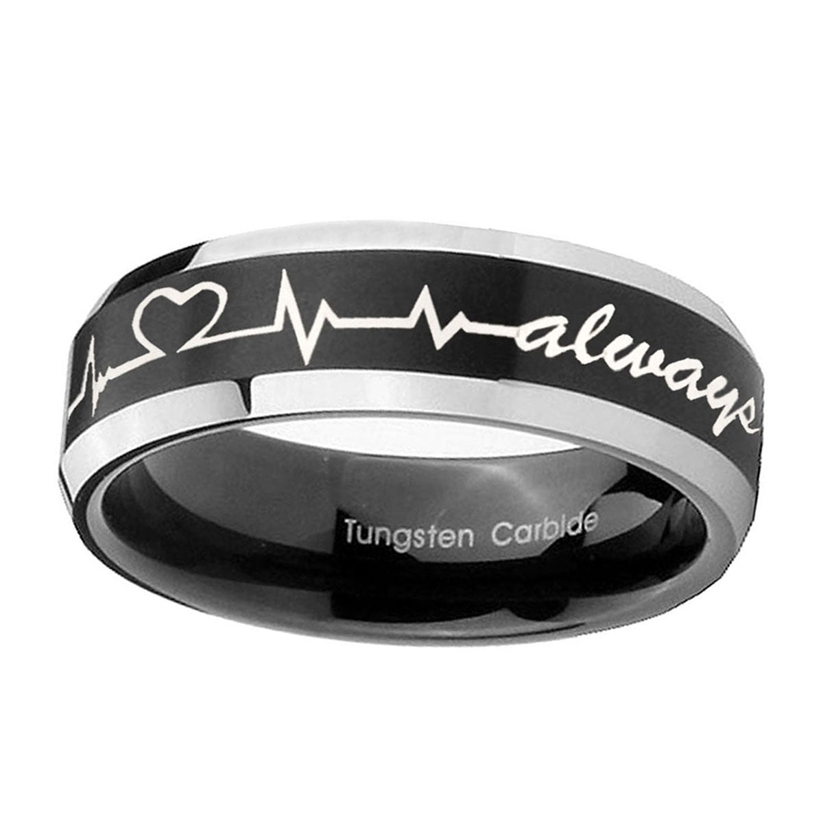 Celebrate with the 10mm Heart Beat forever Heart always Beveled Brush Black 2 Tone Tungsten Bands Ring. This brushed black and 2-tone tungsten ring with Heart Beat design is perfect for weddings.