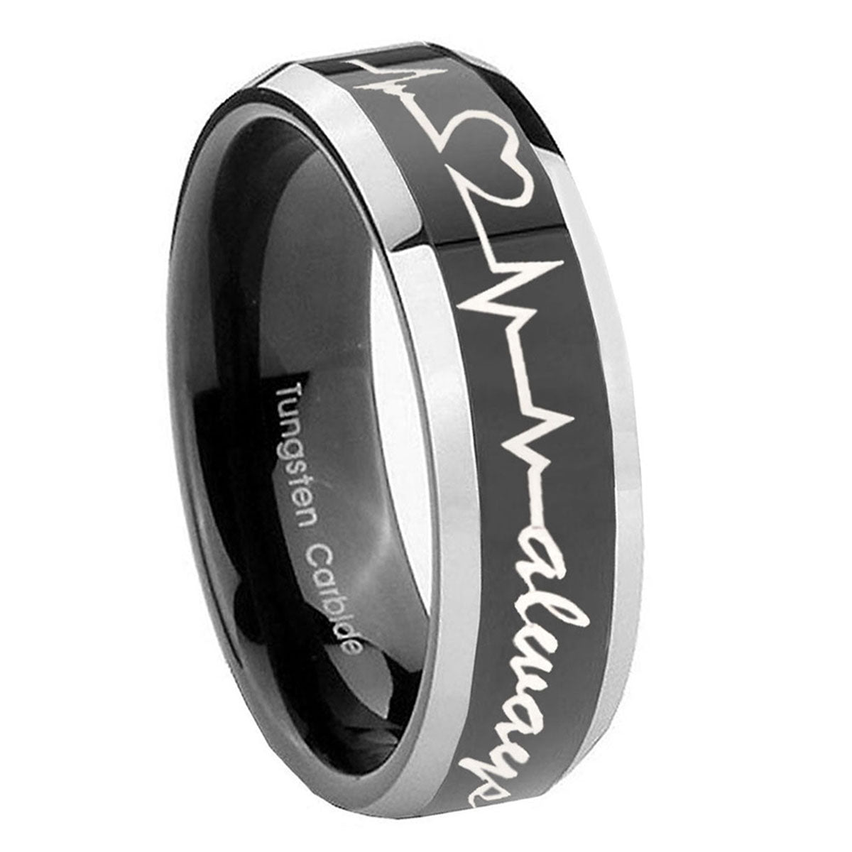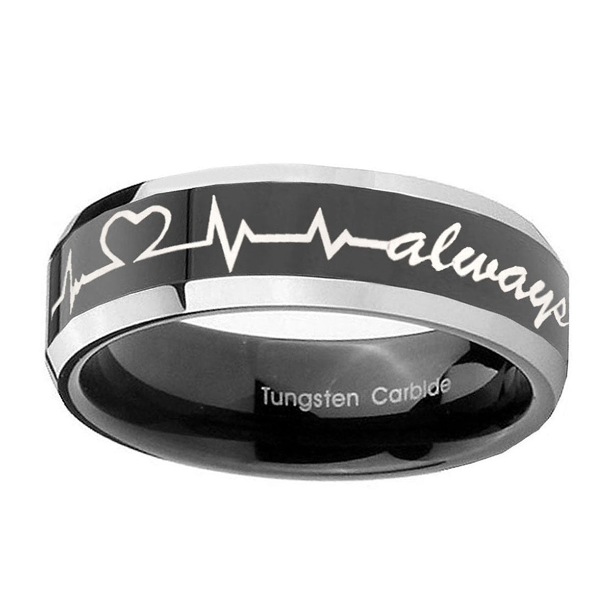 5, 8mm Heart Beat forever Heart always Beveled Glossy Black 2 Tone Tungsten Mens Ring