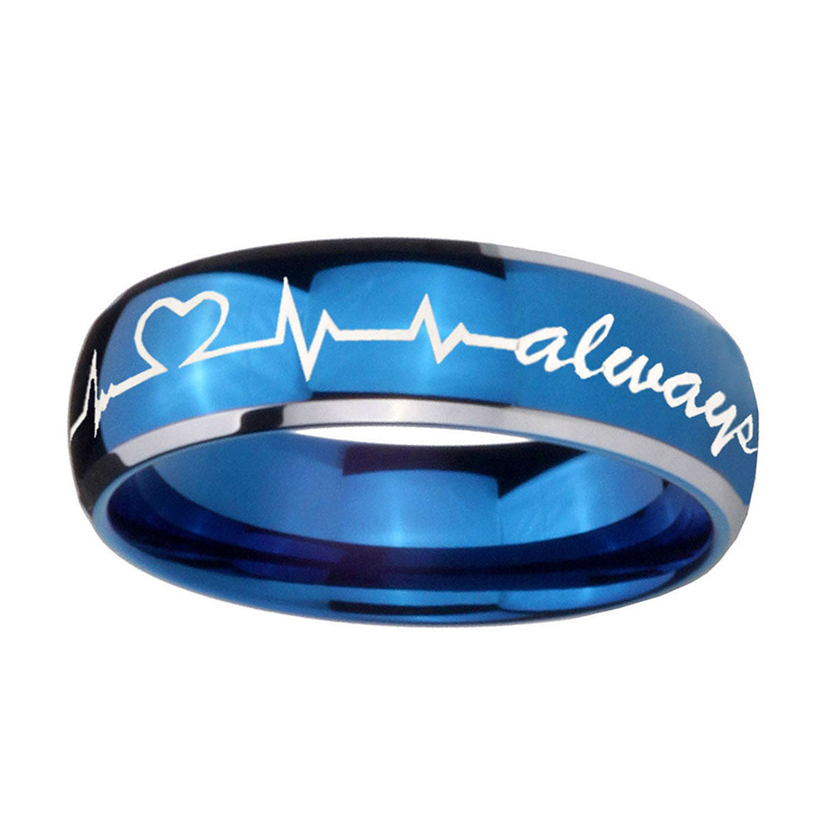 5, 8mm Heart Beat forever Heart always Dome Blue 2 Tone Tungsten Engraved Ring