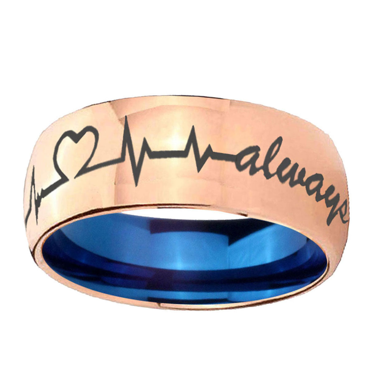 8mm Heart Beat forever Heart always Dome Rose Gold Blue Tungsten Carbide Wedding Ring