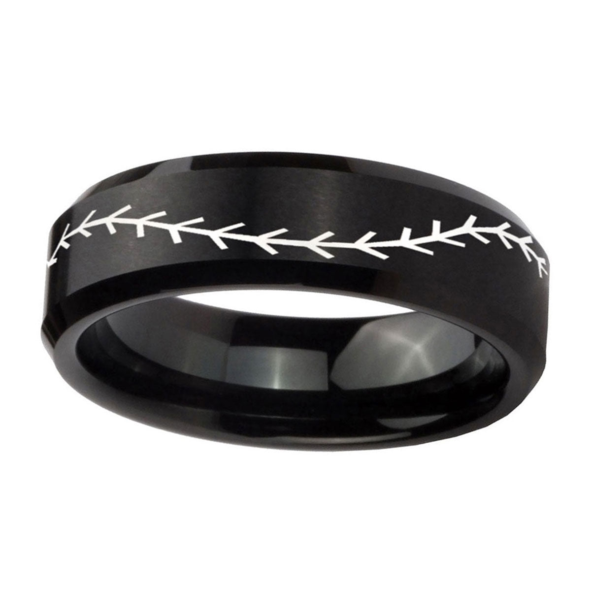 Celebrate with the 10mm Baseball Stitch Beveled Edges Brush Black Tungsten Carbide Men's Band Ring. This brushed black tungsten ring with baseball stitch design is perfect for men.