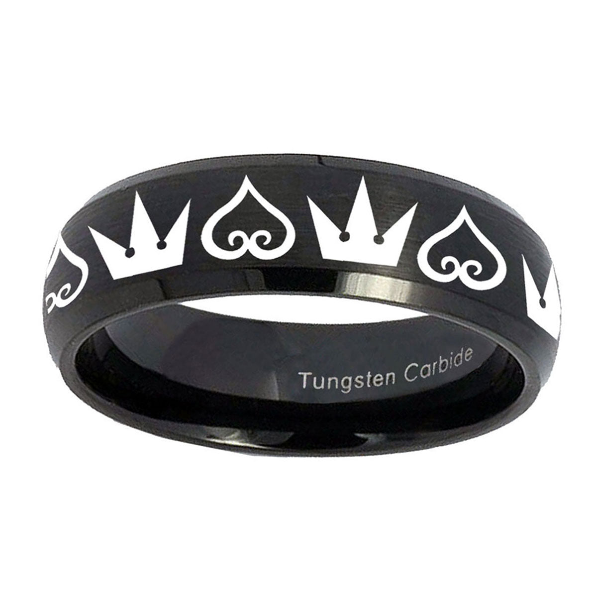 Personalize the 10mm Hearts and Crowns Dome Brush Black Tungsten Carbide Personalized Ring. This brushed black dome ring with Hearts and Crowns design is perfect for custom engravings.