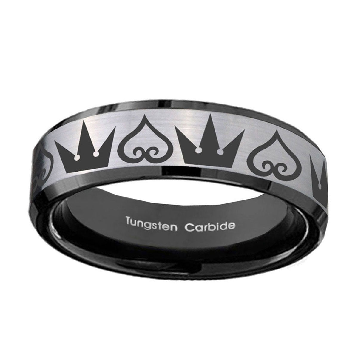 10mm Hearts and Crowns Beveled Edges Brushed Silver Black Tungsten Bands Ring