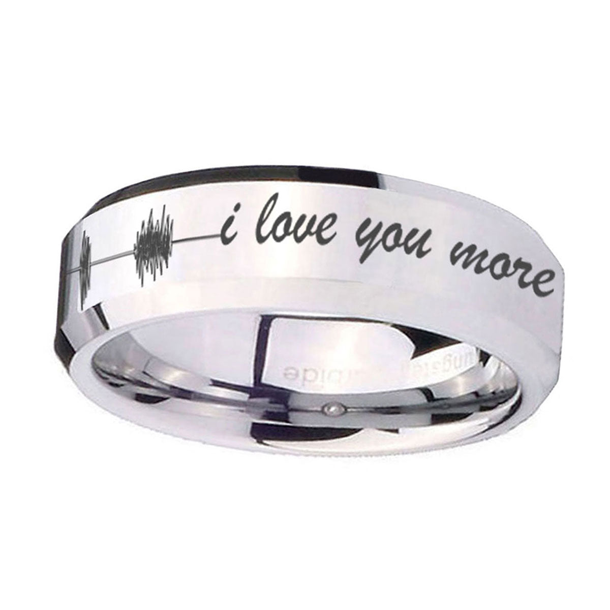 Propose with the 10mm Sound Wave, I love you more Beveled Silver Tungsten Wedding Engagement Ring. This silver tungsten ring with Sound Wave design is ideal for engagements.