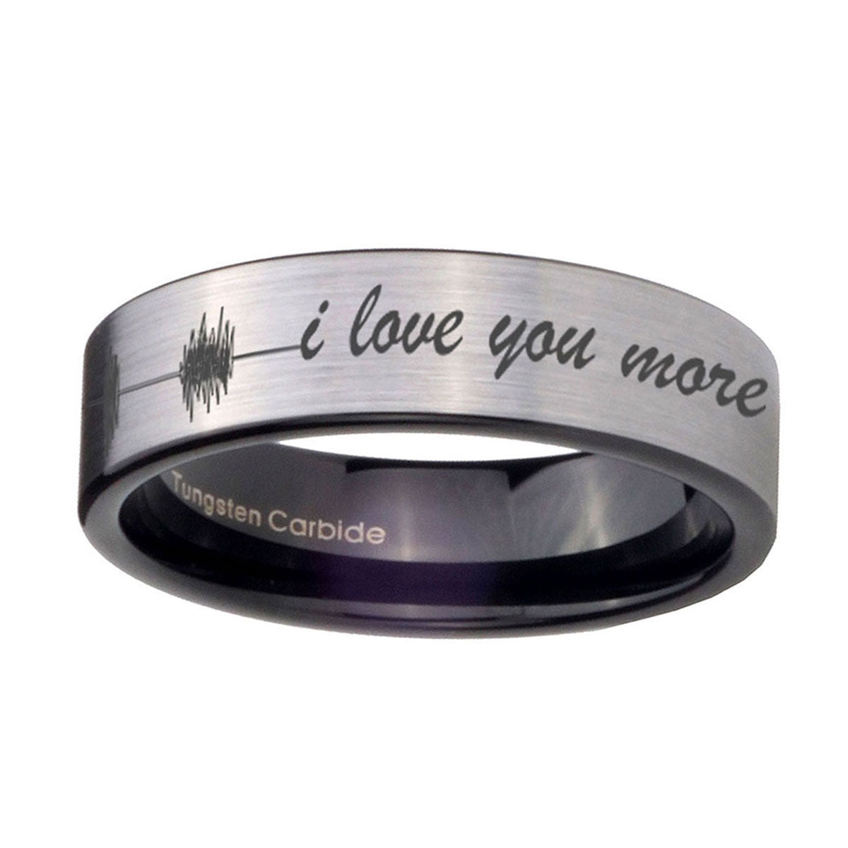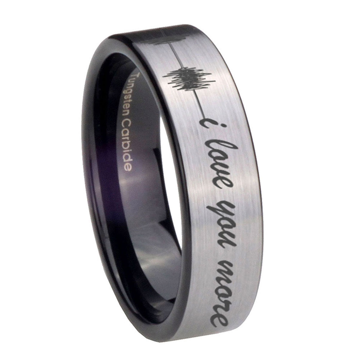 Introuding 6, 8mm Sound Wave, I love you more Pipe Cut Brushed Silver Tungsten Engraved Ring . Offer in both 5mm and 8mm band width brushed silver and black plated fnished from size 4 to 14