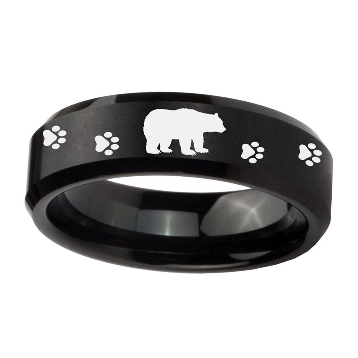 Style the 10mm Bear and Paw Beveled Edges Brush Black Tungsten Carbide Mens Ring. This brushed black tungsten ring with bear and paw design is perfect for men.