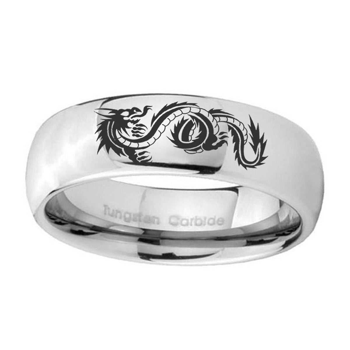 Celebrate milestones with the 10mm Dragon Mirror Dome Tungsten Carbide Mens Anniversary Ring. This polished mirror dome ring with Dragon design is perfect for anniversaries.