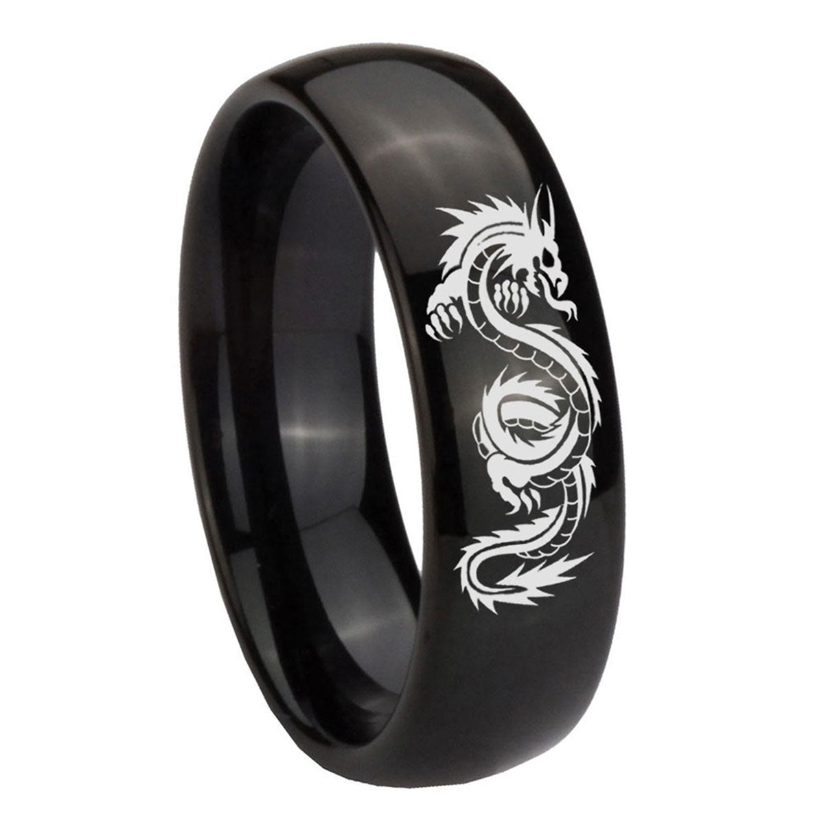 Celebrate with the 10mm Dragon Dome Black Tungsten Carbide Wedding Bands Ring. This dome-shaped black tungsten ring with Dragon design is perfect for weddings.