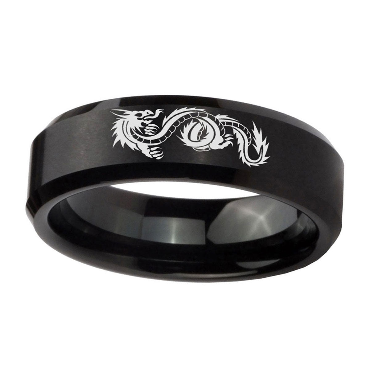 Celebrate with the 10mm Dragon Beveled Edges Brush Black Tungsten Carbide Men's Wedding Band. This brushed black tungsten ring with Dragon design is perfect for weddings.