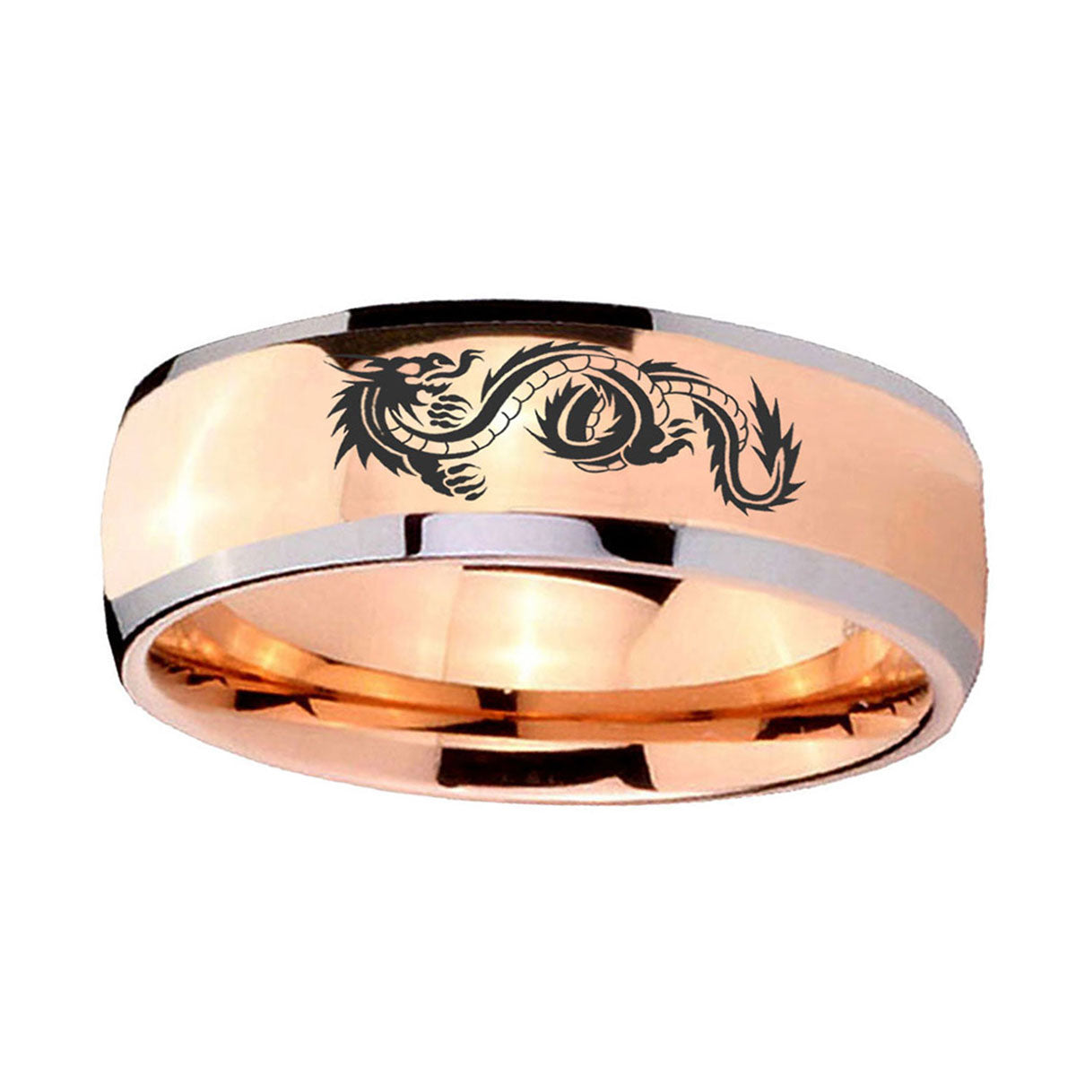 Introuding 5, 8mm Dragon Dome Rose Gold Tungsten Carbide Wedding Engraving Ring . Offer in both 5mm and 8mm band width two tone rose gold plated fnished from size 4 to 14