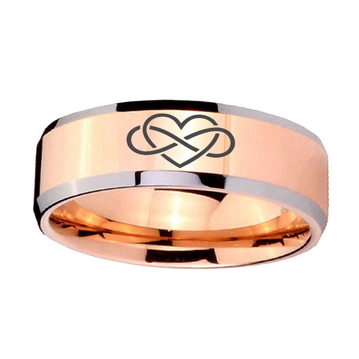 Style the 10mm Infinity Love Beveled Edges Rose Gold Tungsten Carbide Men's Band Ring. This rose gold tungsten ring with Infinity Love design is perfect for men.