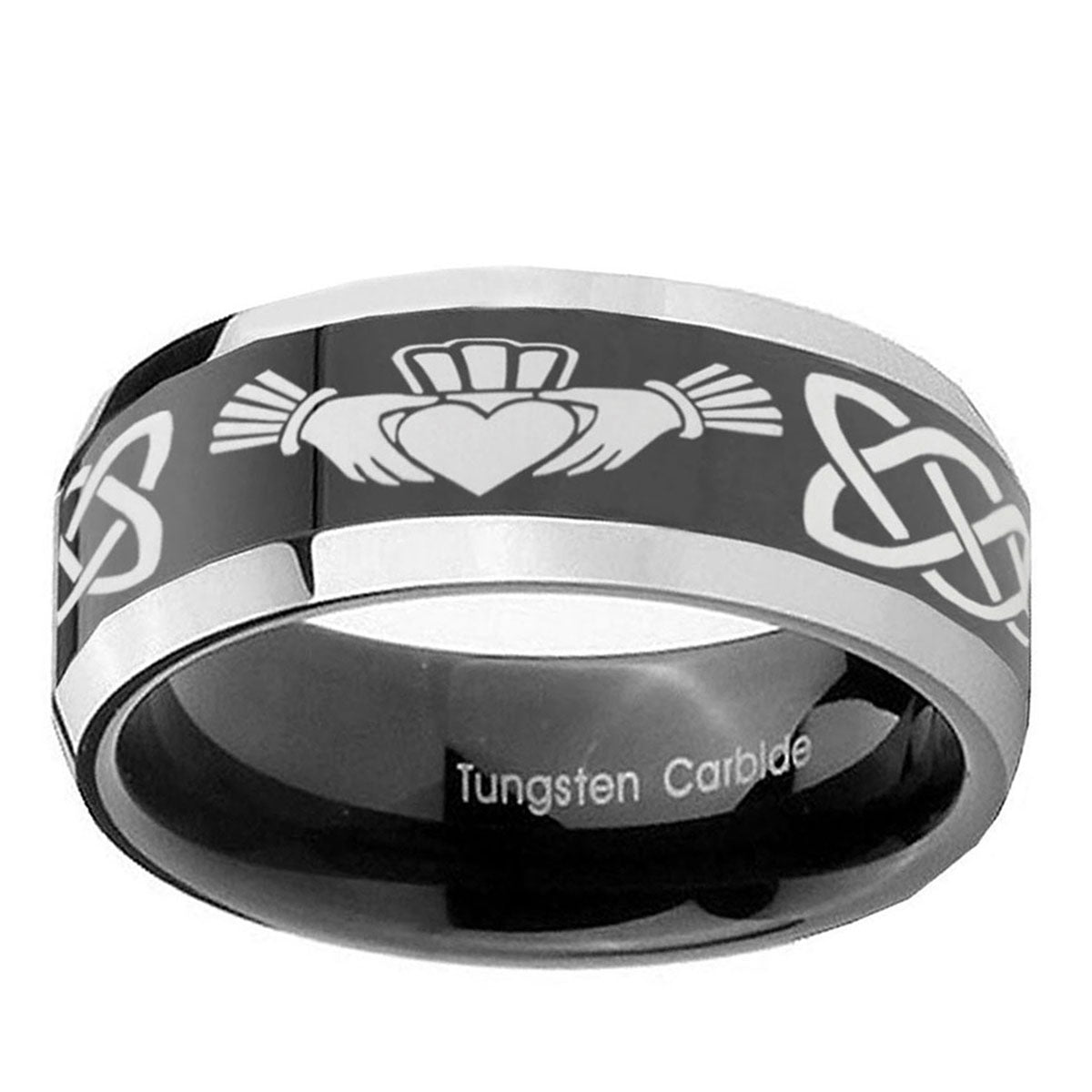 5, 8mm Irish Claddagh Beveled Edges Glossy Black 2 Tone Tungsten Mens Wedding Ring