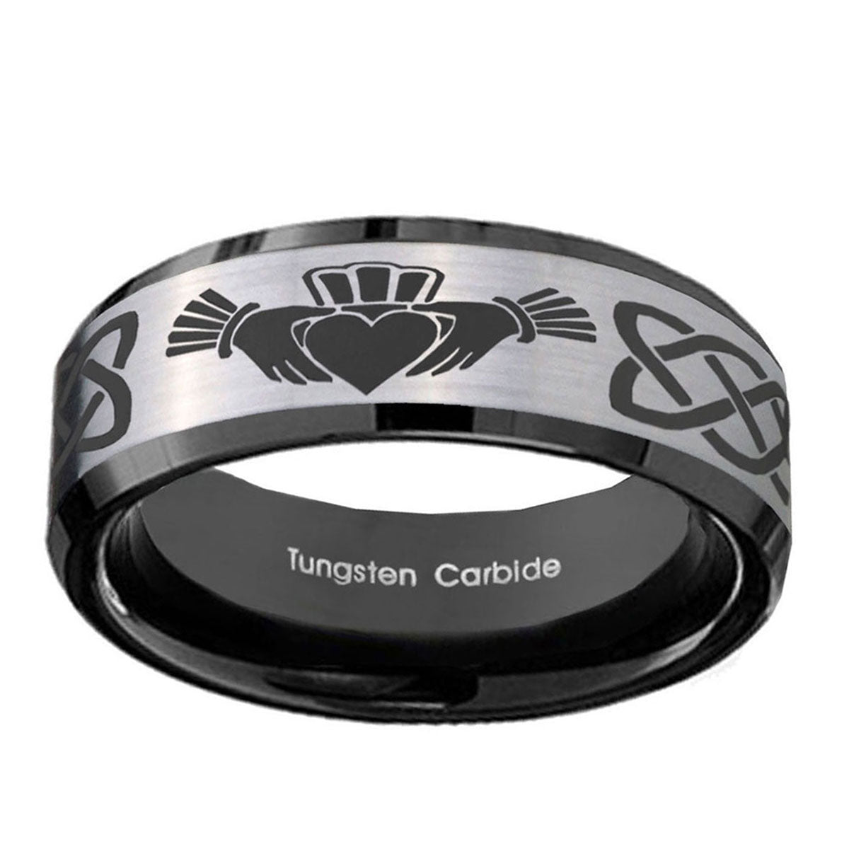 10mm Irish Claddagh Beveled Brushed Silver Black Tungsten Custom Mens Ring
