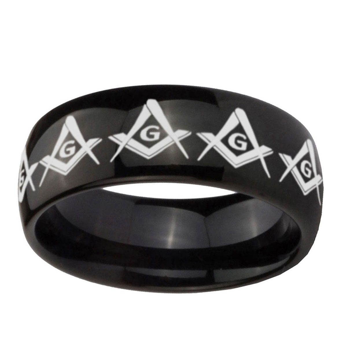 10mm Masonic Square and Compass Dome Black Tungsten Carbide Mens Anniversary Ring