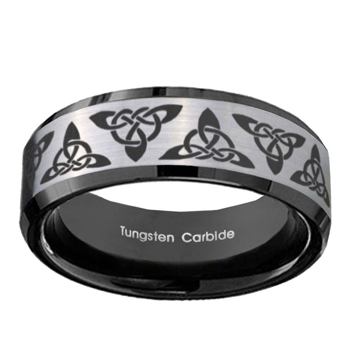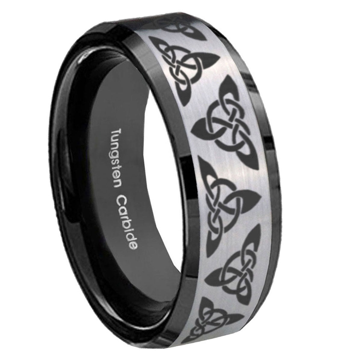 10mm Celtic Knot Beveled Brushed Silver Black Tungsten Custom Mens Ring