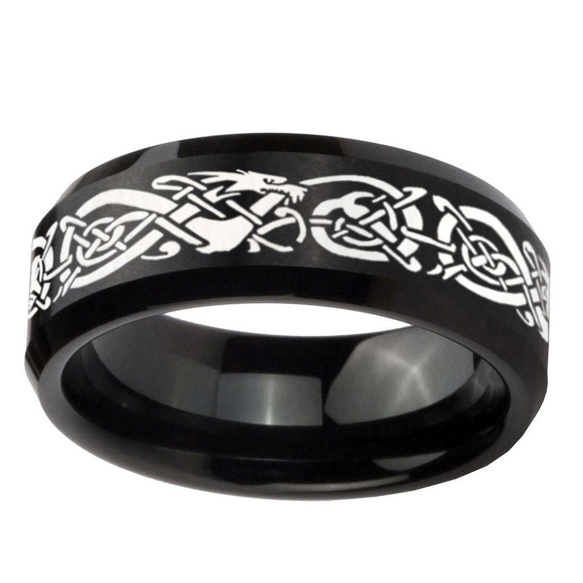 Celebrate with the 10mm Celtic Knot Dragon Beveled Edges Brush Black Tungsten Wedding Band Ring. This brushed black tungsten ring with Celtic knot dragon design is perfect for weddings.