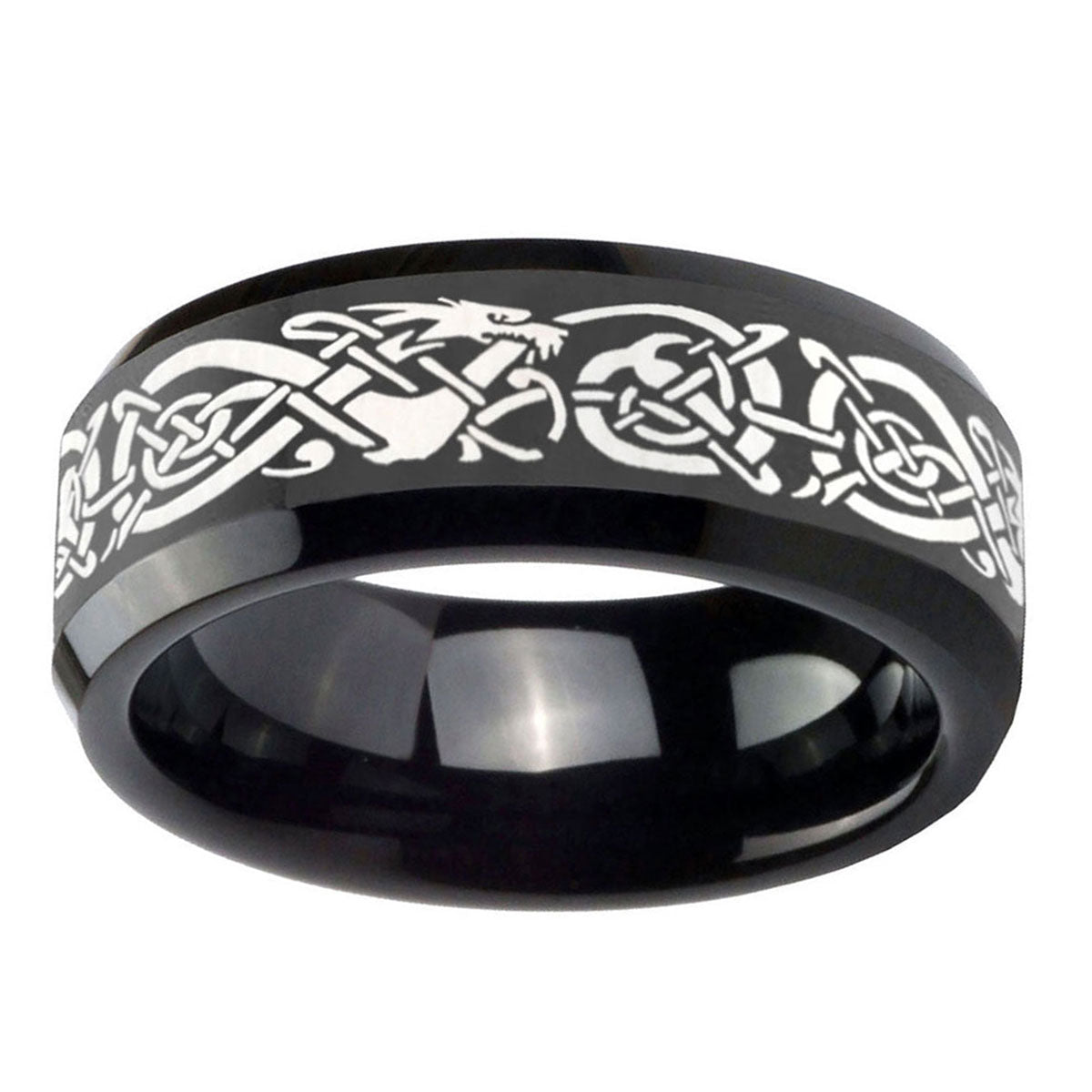 5, 8mm Celtic Knot Dragon Beveled Edges Black Tungsten Carbide Bands Ring