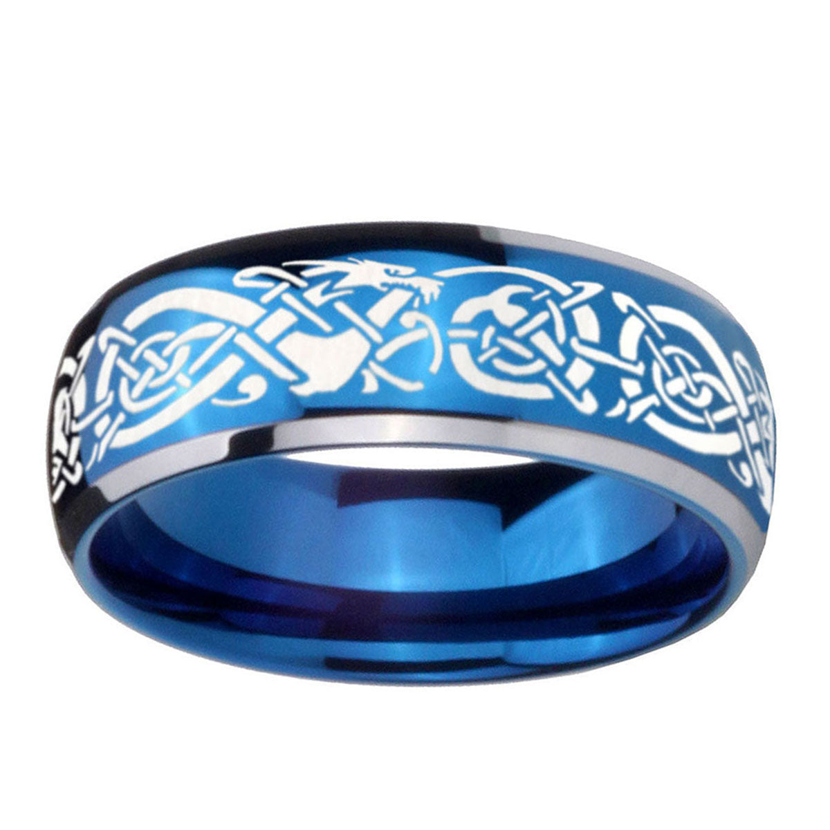 Introuding 5, 8mm Celtic Knot Dragon Dome Blue 2 Tone Tungsten Carbide Mens Ring Engraved . Offer in both 5mm and 8mm band width polished blue plated 2 tone fnished from size 4 to 14