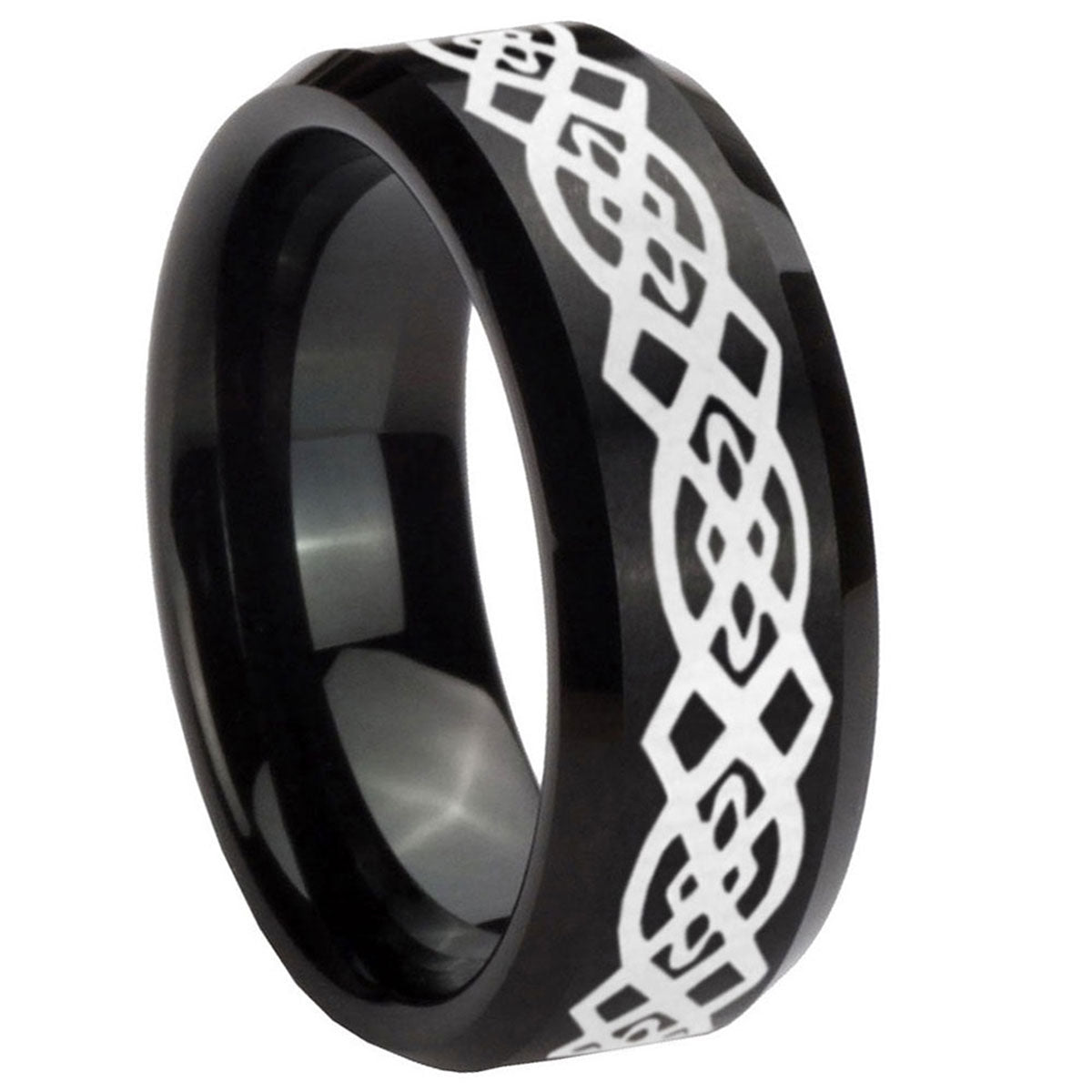 Celebrate with the 10mm Celtic Knot Beveled Edges Brush Black Tungsten Carbide Wedding Bands Ring. This brushed black tungsten ring with Celtic knot design is perfect for weddings.